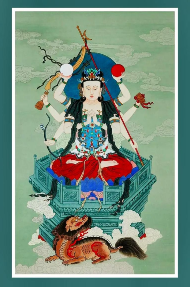 Yuanming Daomu Tianzun has a very majestic and peculiar appearance: there is a third eye on the forehead, and four heads on the shoulders. The so-called four heads are actually one head with faces on four sides. There are four arms growing on each side of the upper body, totaling eight arms. The two hands in the middle are clasped in a mudra, while the other hands hold the sun, moon, treasure bell, golden seal, bow, halberd, etc. The divine image has a kind and radiant countenance.